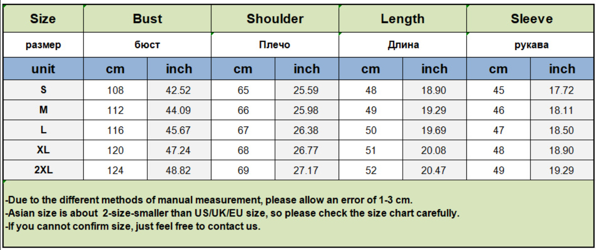 Note: 1. Asian sizes are 1 to 2 sizes smaller than European and American people. Choose the larger size if your size between two sizes. Please allow 2-3cm differences due to manual measurement. 2. Please check the size chart carefully before you buy the item, if you don't know how to choose size, please contact our customer service. 3.As you know, the different computers display colors differently, the color of the actual item may vary slightly from the following images.